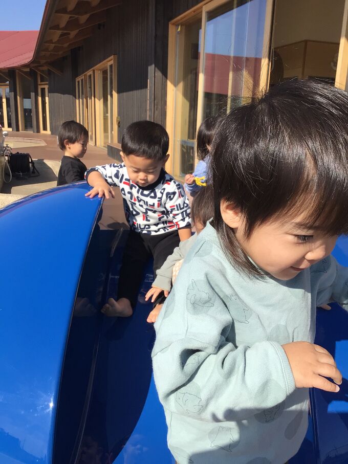 お部屋「カスタネット」の目の前のテラスにある、丸餅みたいな可愛い遊具は、たまごさん専用のすべり台です!
