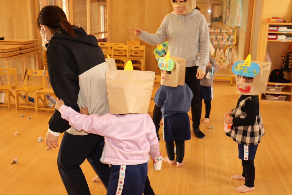 先生が扮したやさし~い鬼さんでしたが、びっくりしてしまうお友達もいれば、「この鬼、先生でしょ~!ばれてるよ!」というたくましいお友達も!