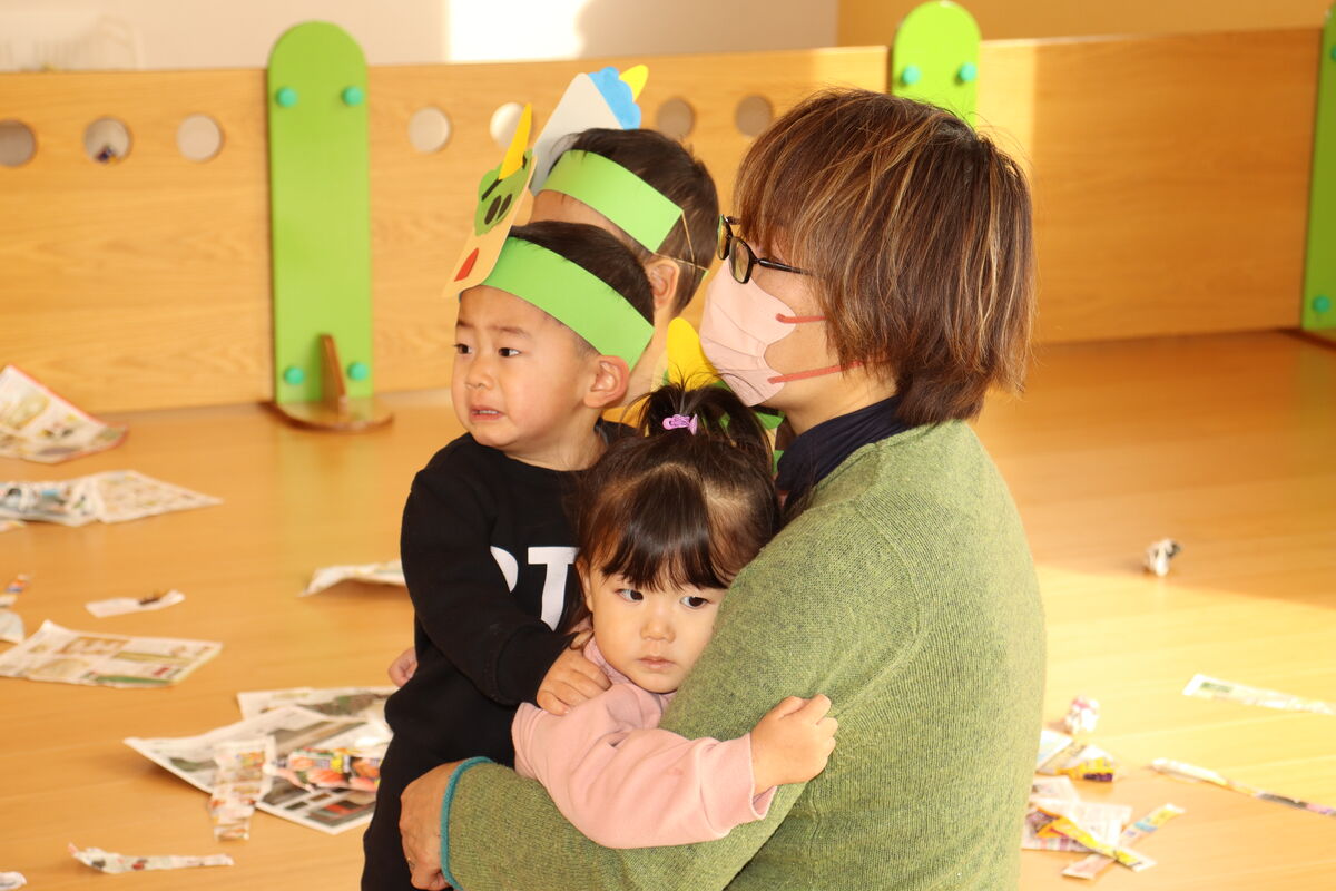 たまごさんにも、やさし~いこむぎ先生オニが少し顔を見せにきました!「あれ、こむぎ先生どうしたの?」というようなお顔をしているお友達や、びっくりして泣いてしまうお友達もいましたが、すぐにお面をとって「こむぎ先生だよ~!」とぎゅー! あ~よかった!!