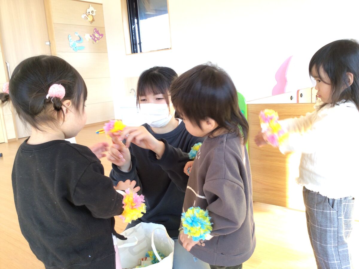 今日の年少さんは、と~ってもカラフルな頭をしたお友達?先生?と遊んだようです![]()