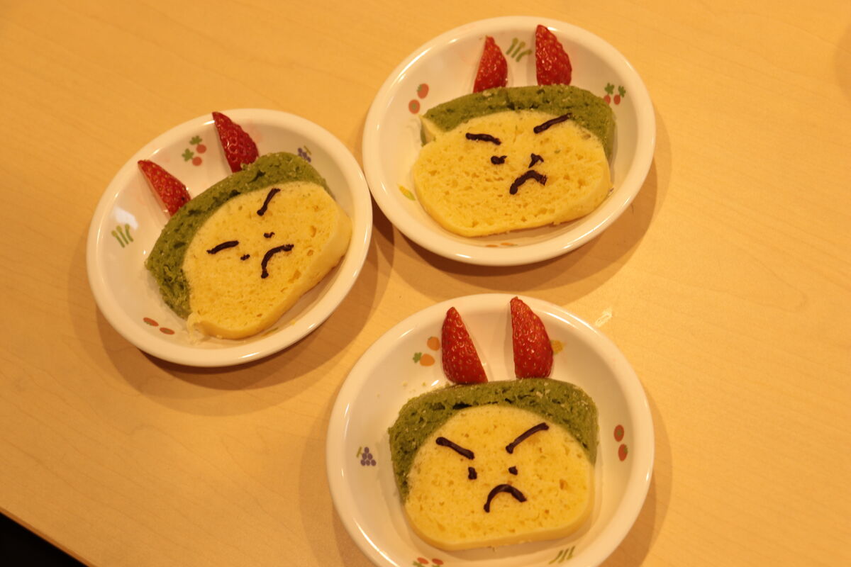 給食の日には、節分にちなんだオニバーグや、おやつには美味しいかわいい鬼さんの蒸しケーキをみんなで食べました^^