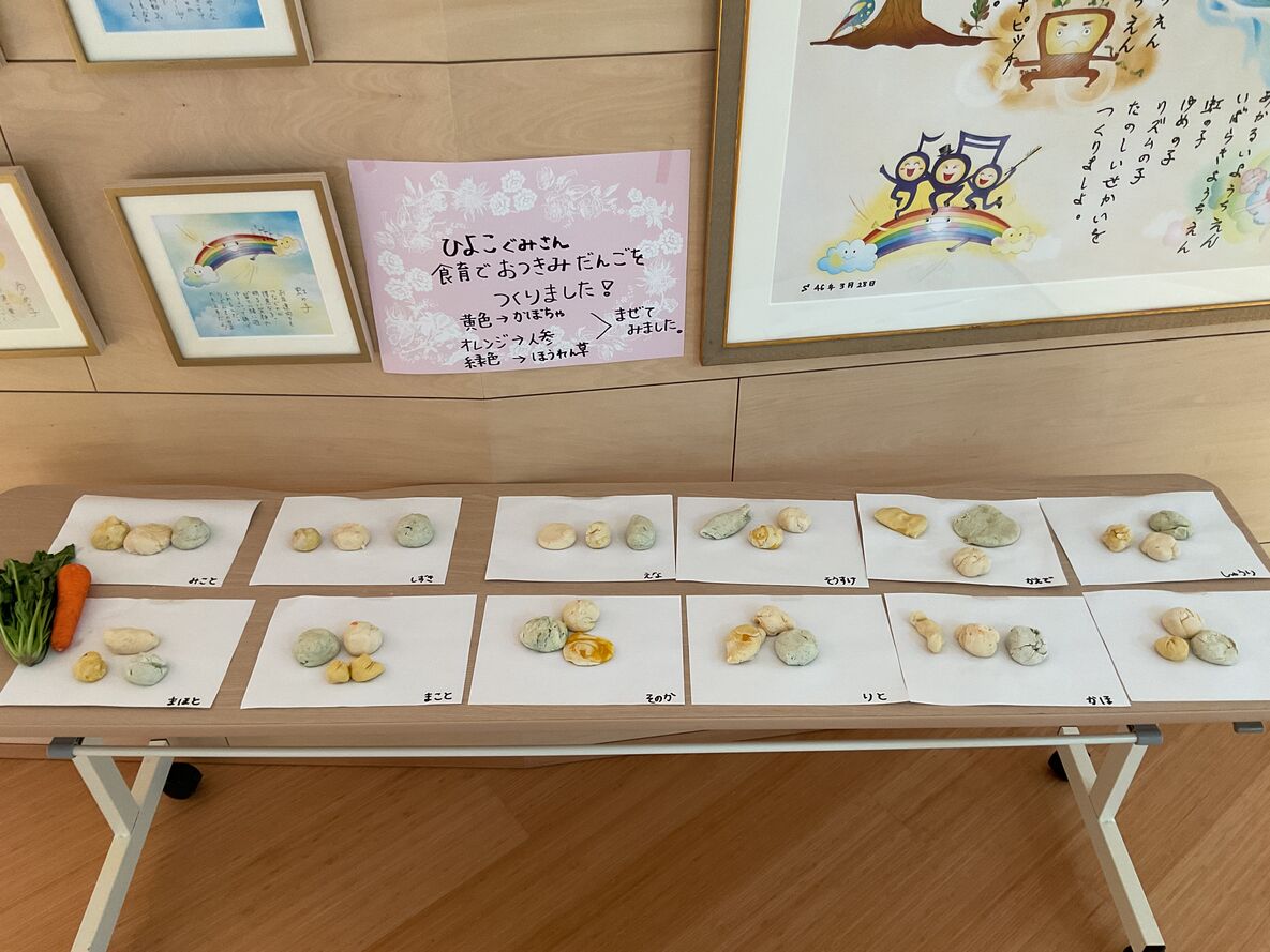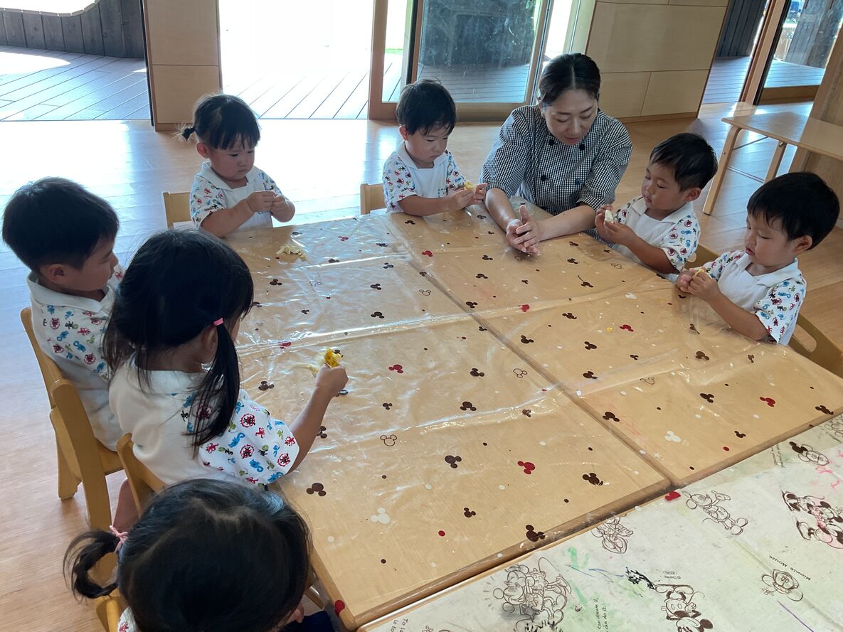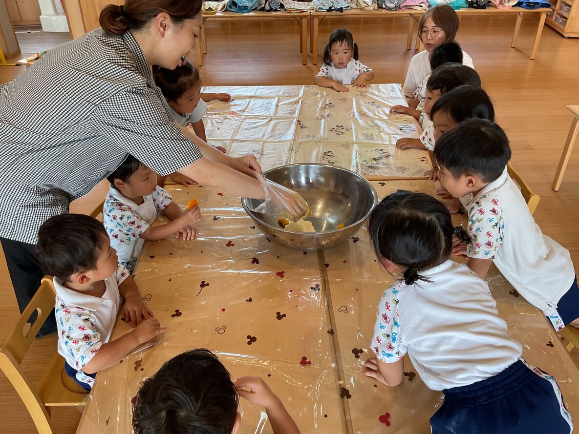 にんじんやほうれんそう、かぼちゃを混ぜてみて、色や感触の違いを楽しんでいました!
