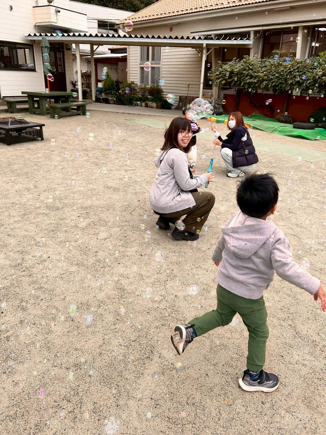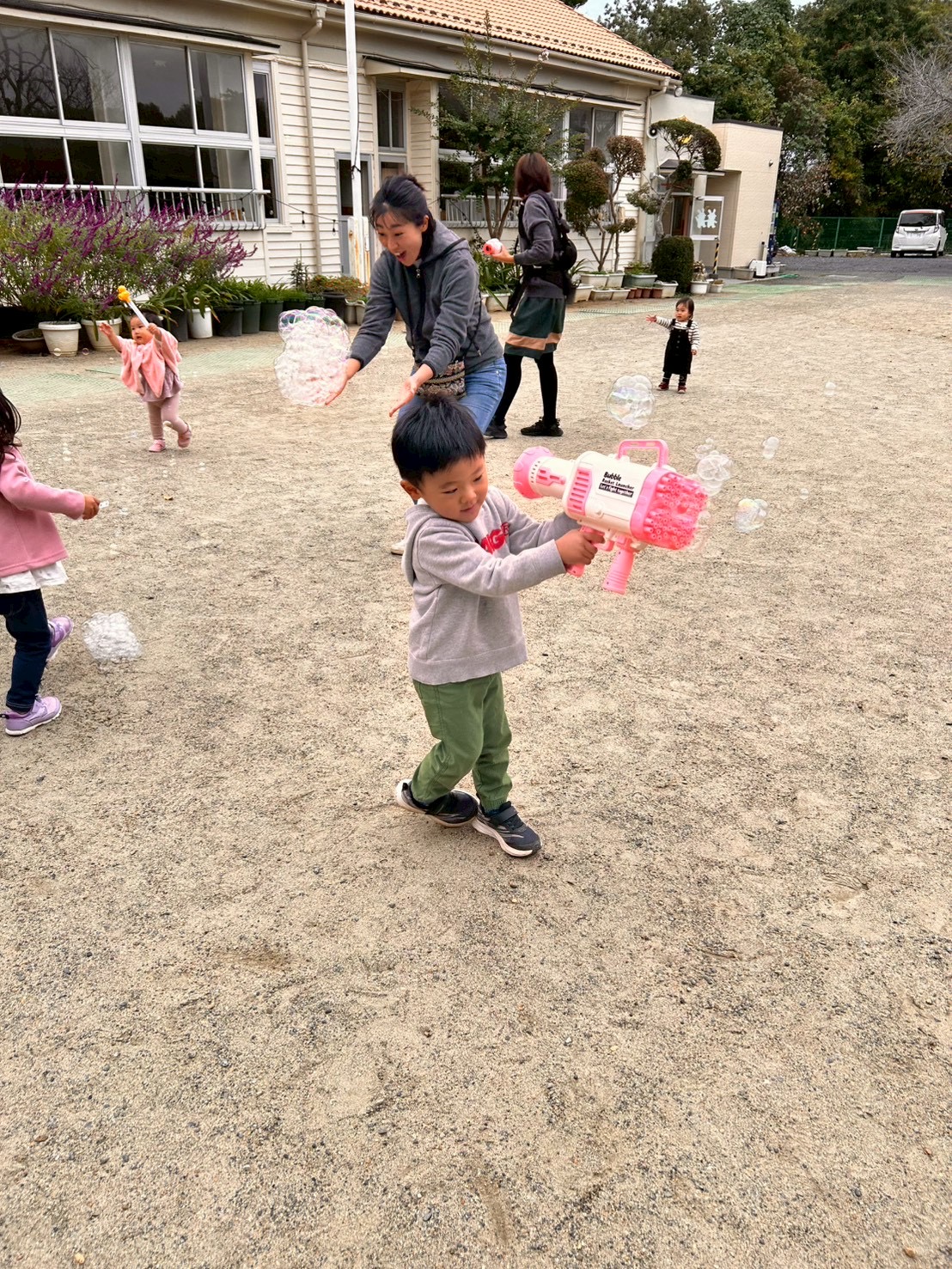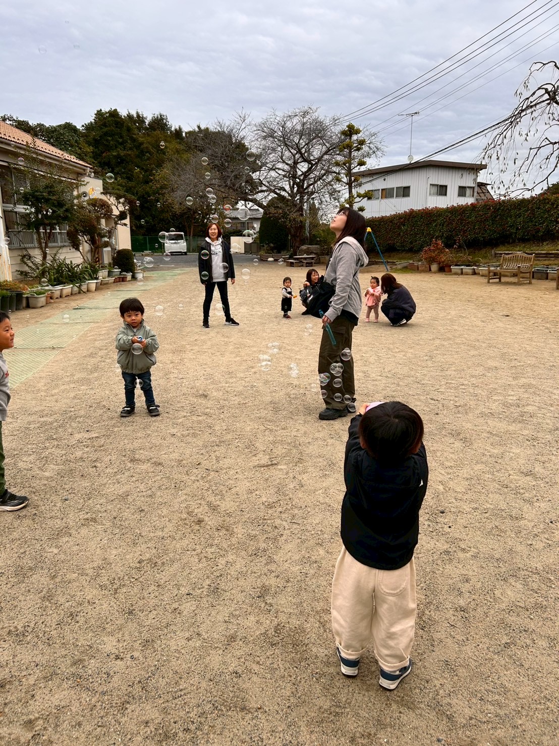 本日は雨の心配もありましたが☔️、お天気もなんとかもってみんな元気いっぱいに寒さを吹き飛ばす笑顔で園庭でシャボン玉遊びを楽しみました😊