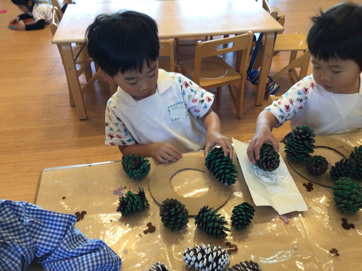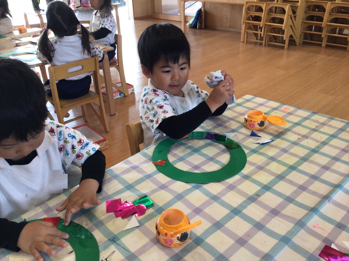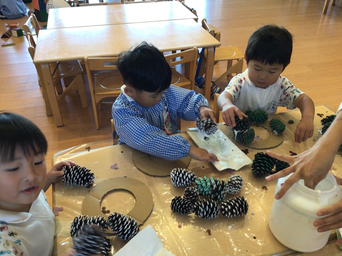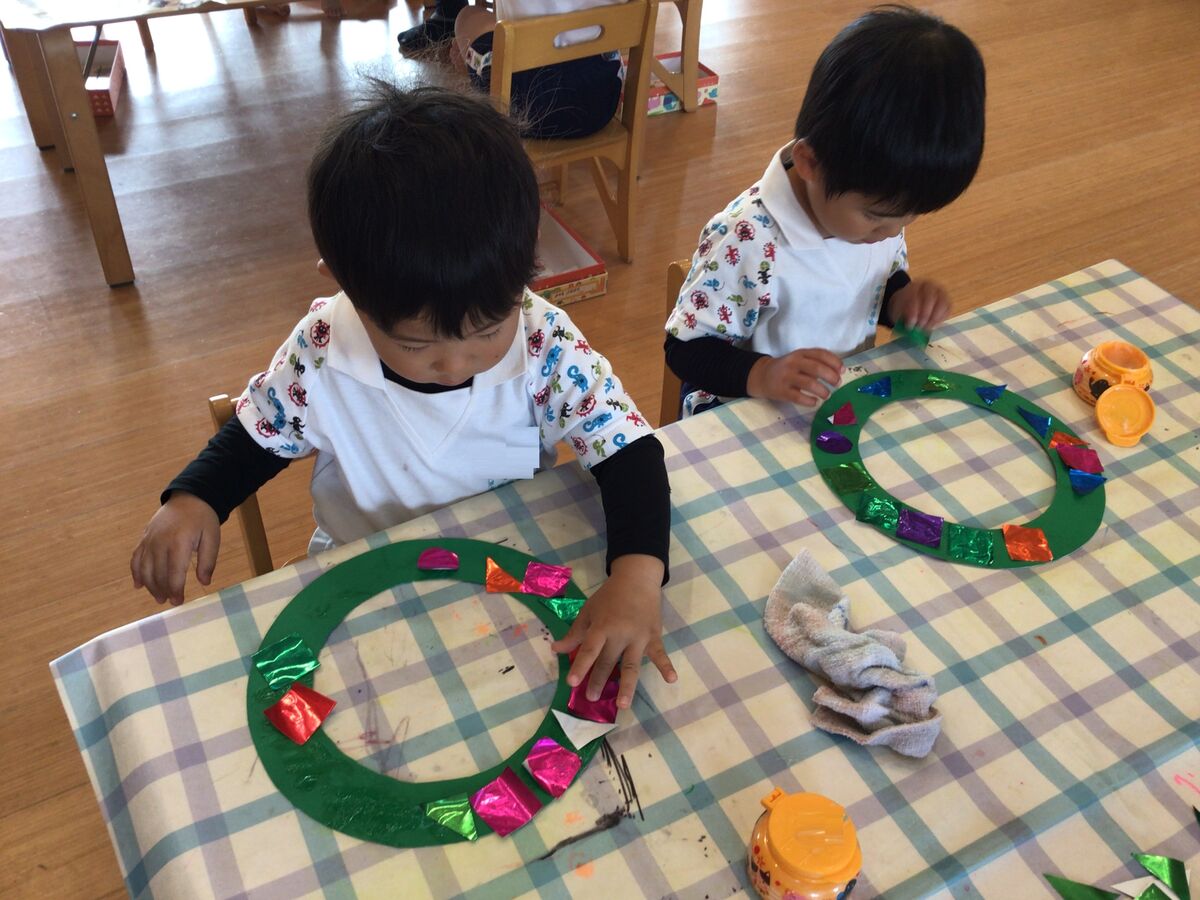 年少さんは、色を塗った松ぼっくりを使って、素敵なリースを作っているようです!ひよこさんも、キラキラの折り紙を使って、リース制作にチャレンジ中です♫