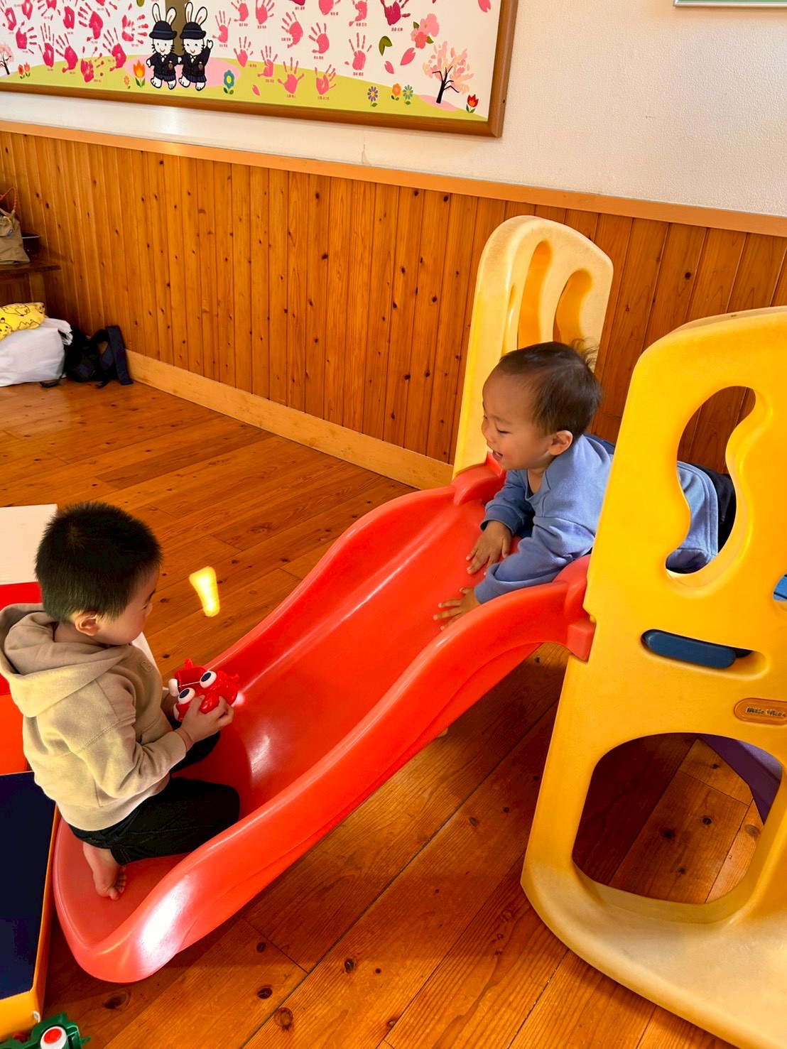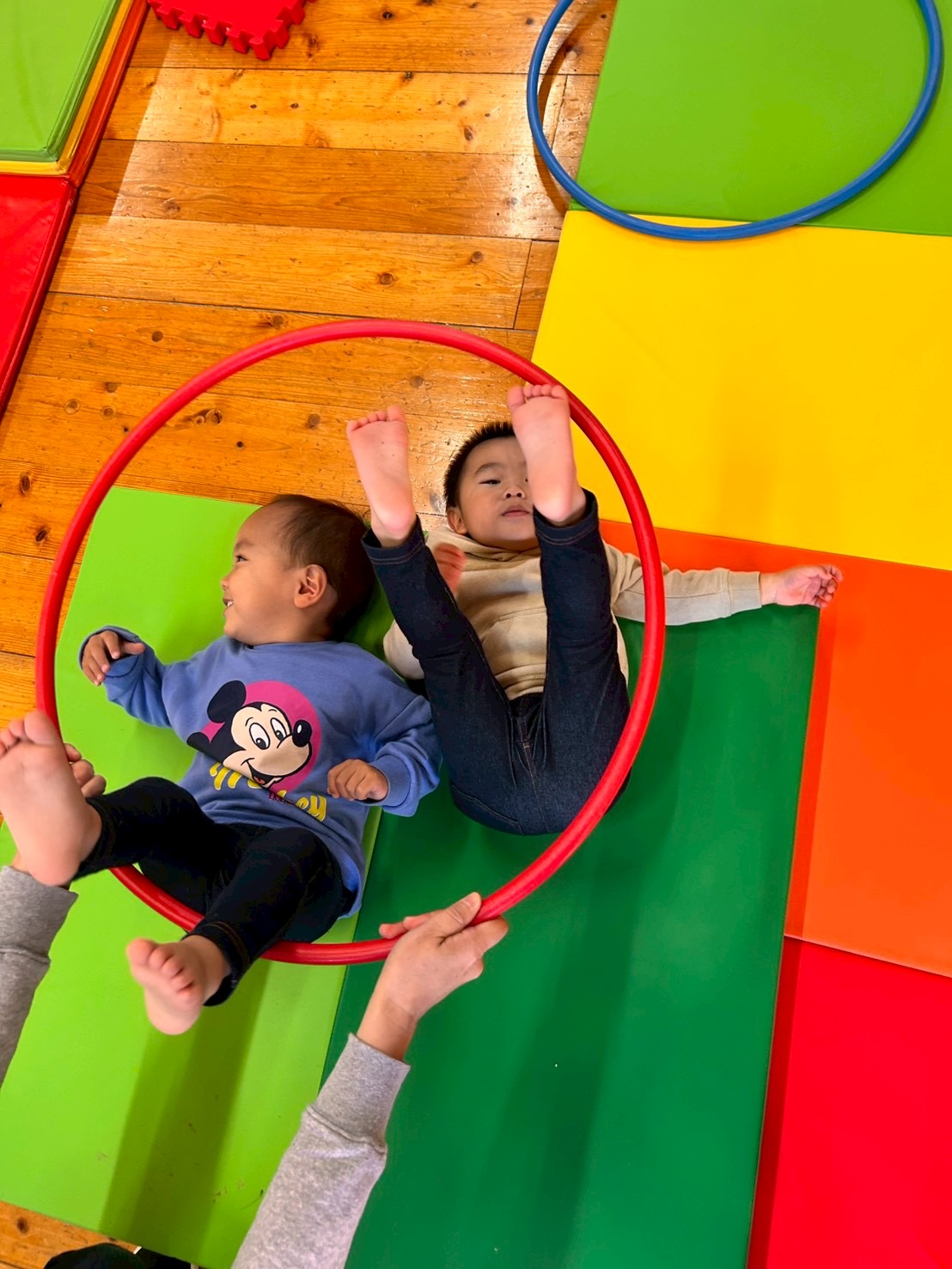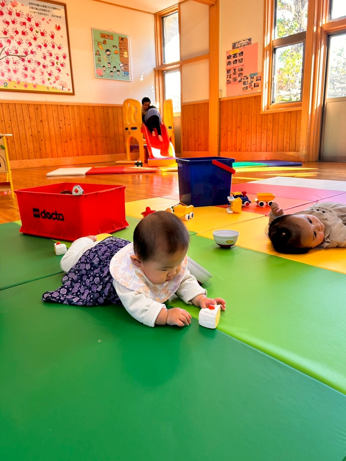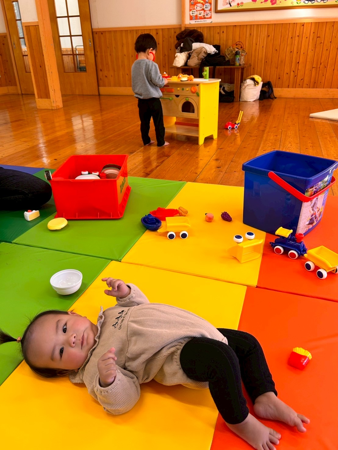 お子様たちはママが見えるところで先生たちと一緒に玩具で遊びました😁元気に走り回るお友達💨や一生懸命ハイハイしようと頑張る可愛いお友達👶🩷も遊びに来てくれました🙌