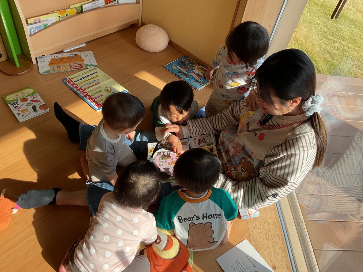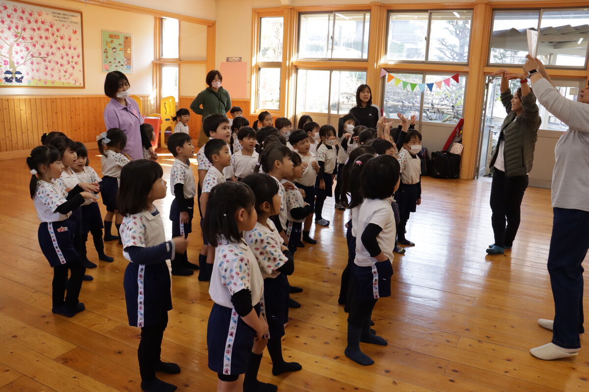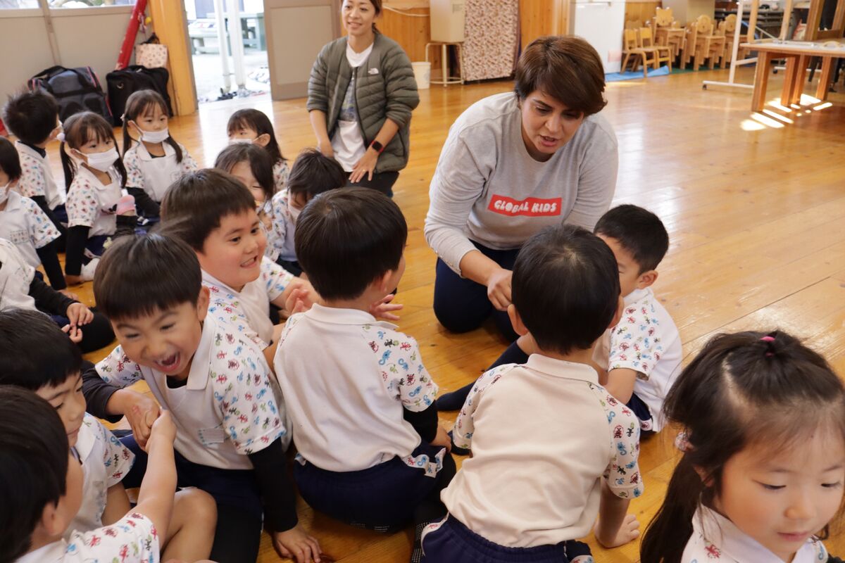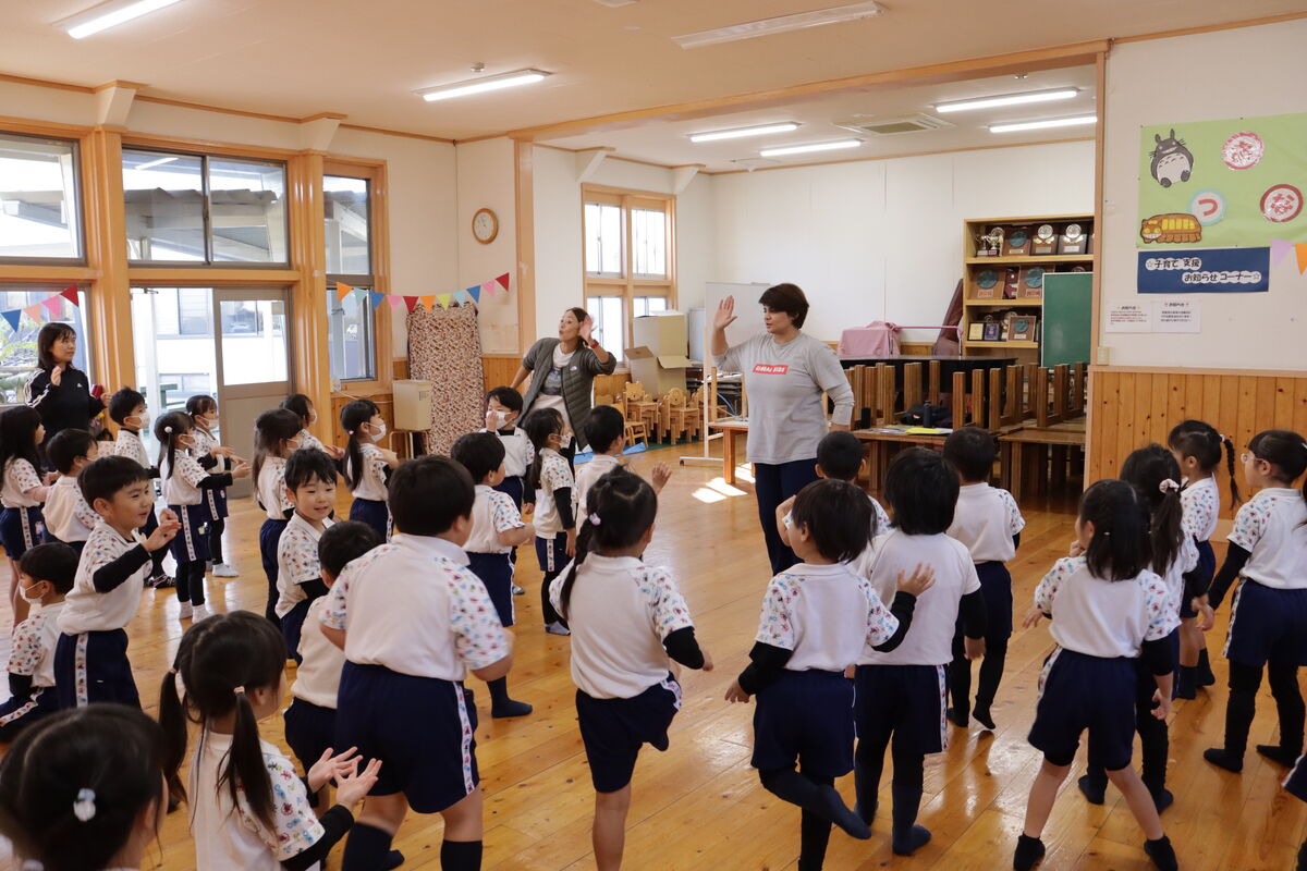 バスに乗って旧園舎に移動し…年長さん・年中さんはフメラ先生と歌って踊って楽しく英語に親しんだり、英語の絵本を読んでもらったりしました。いつか来る、海外の方と話す場面で…フメラ先生と楽しい時間を過ごしたことがきっと活きることでしょう^^
