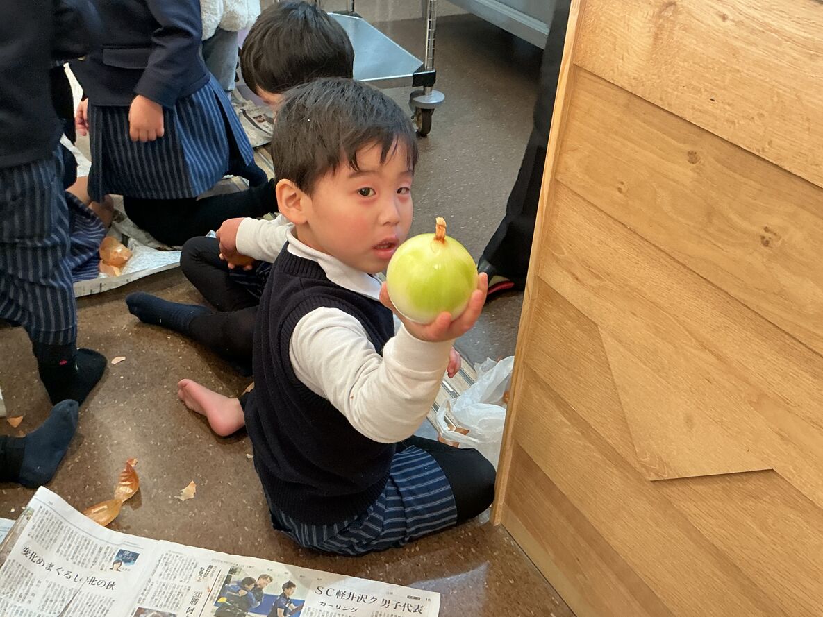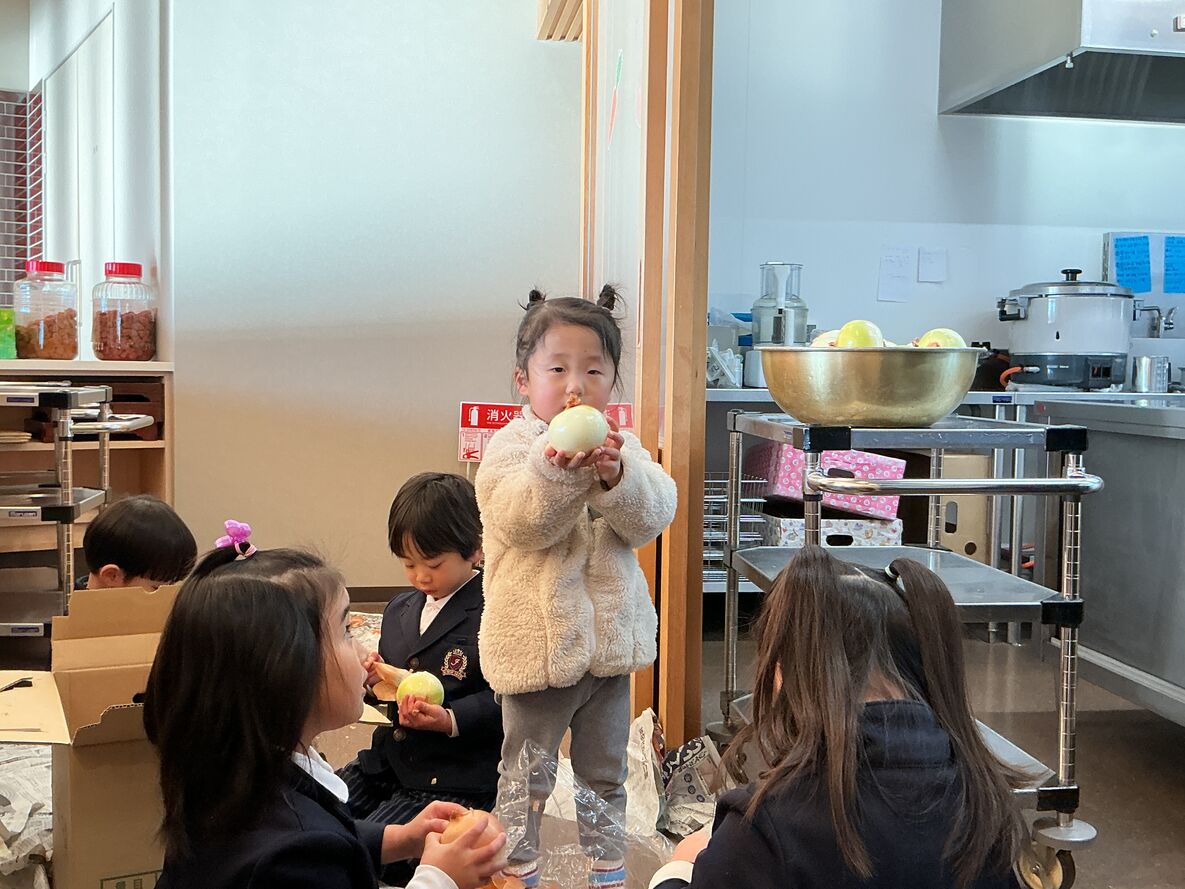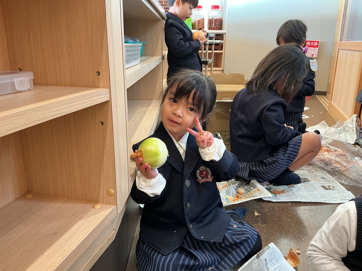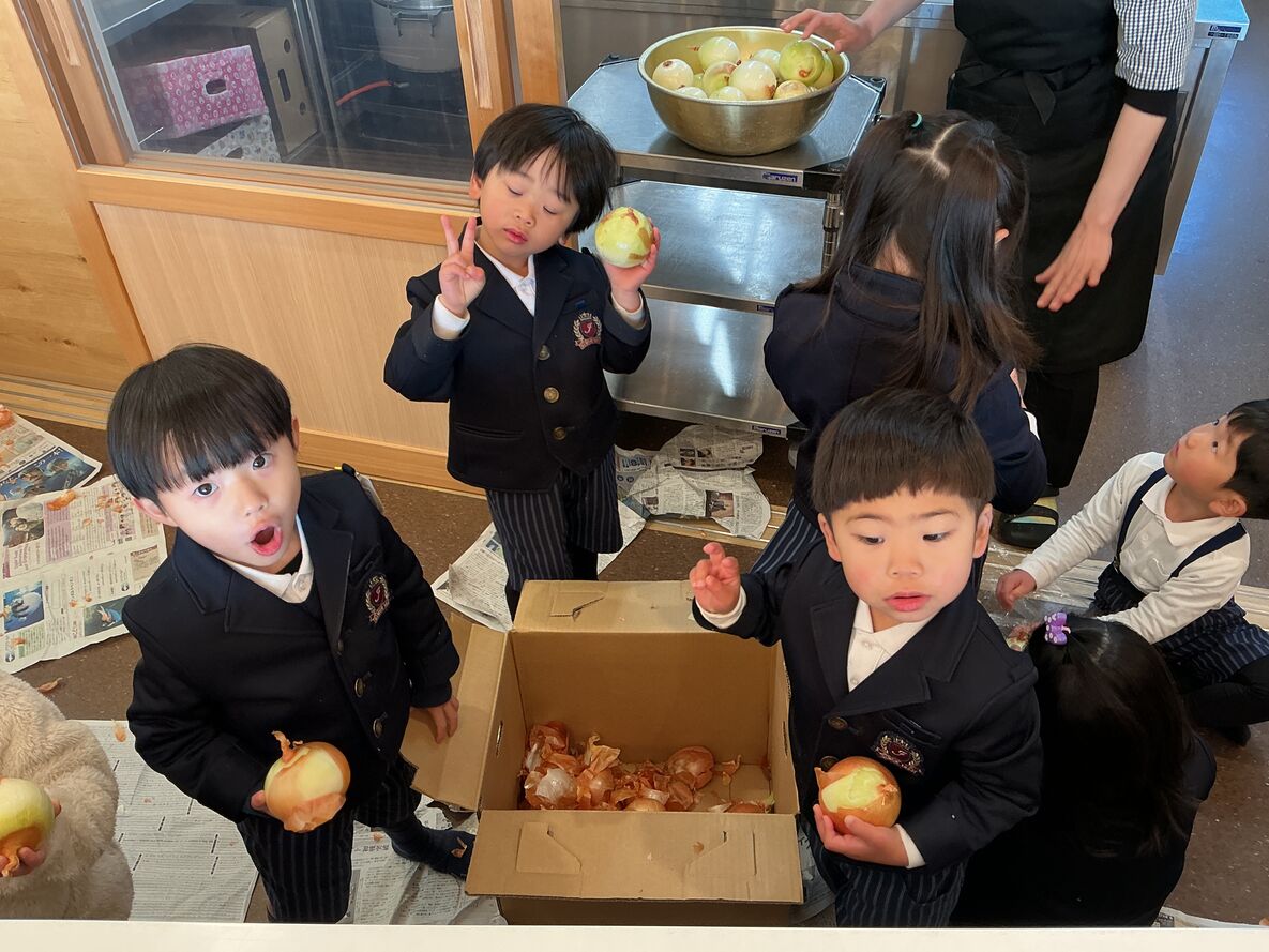 本日の給食・カレーの材料、玉ねぎの皮むきをお手伝いしてくれているお友達がた~くさんいました😄!!
