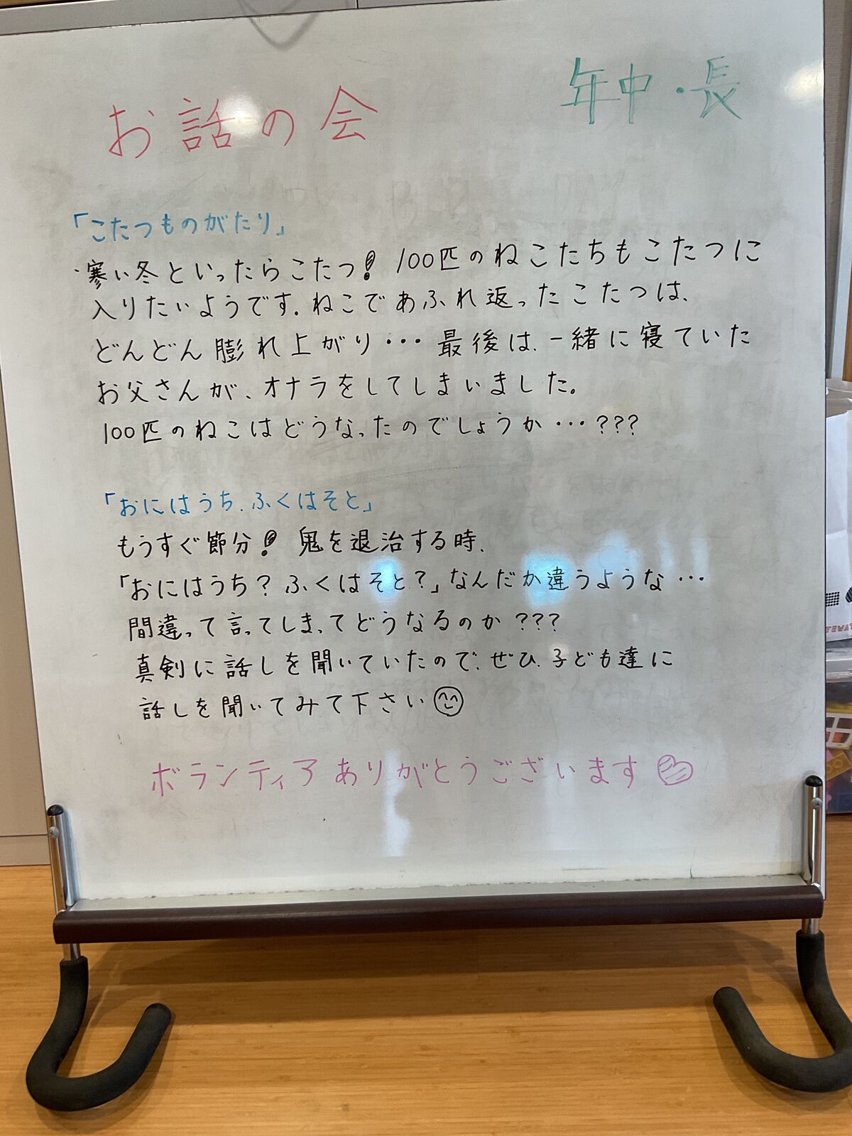 火曜日に来て下さった、❝お話の会❞で聞かせてもらったお話をホワイトボードでご紹介しました♪ぜひ、お家でもどんな物語だったかお話してみてください😄