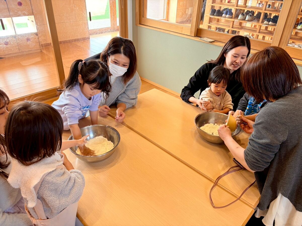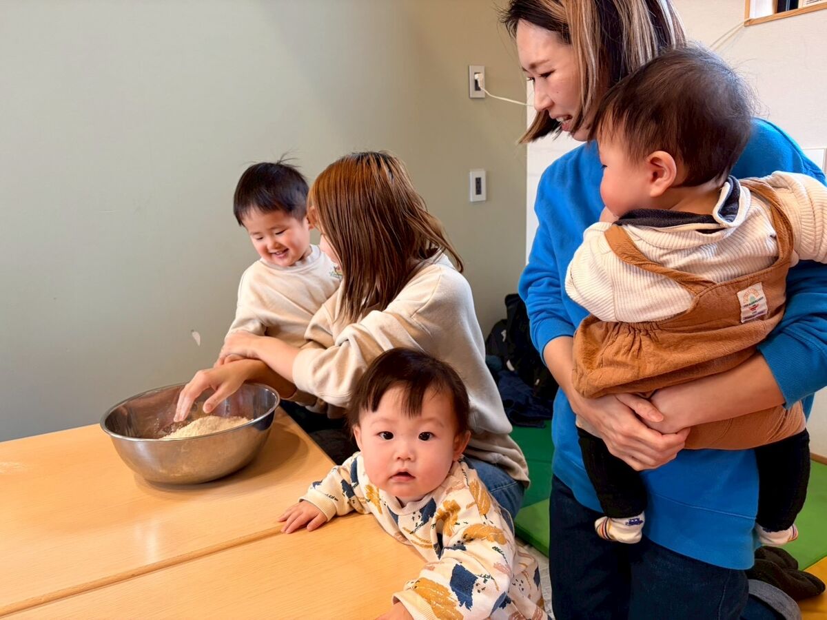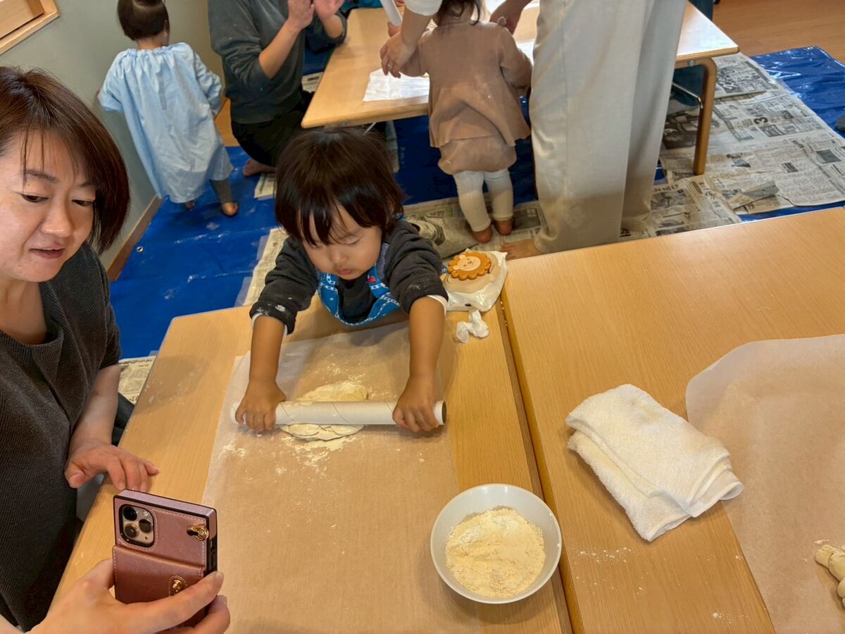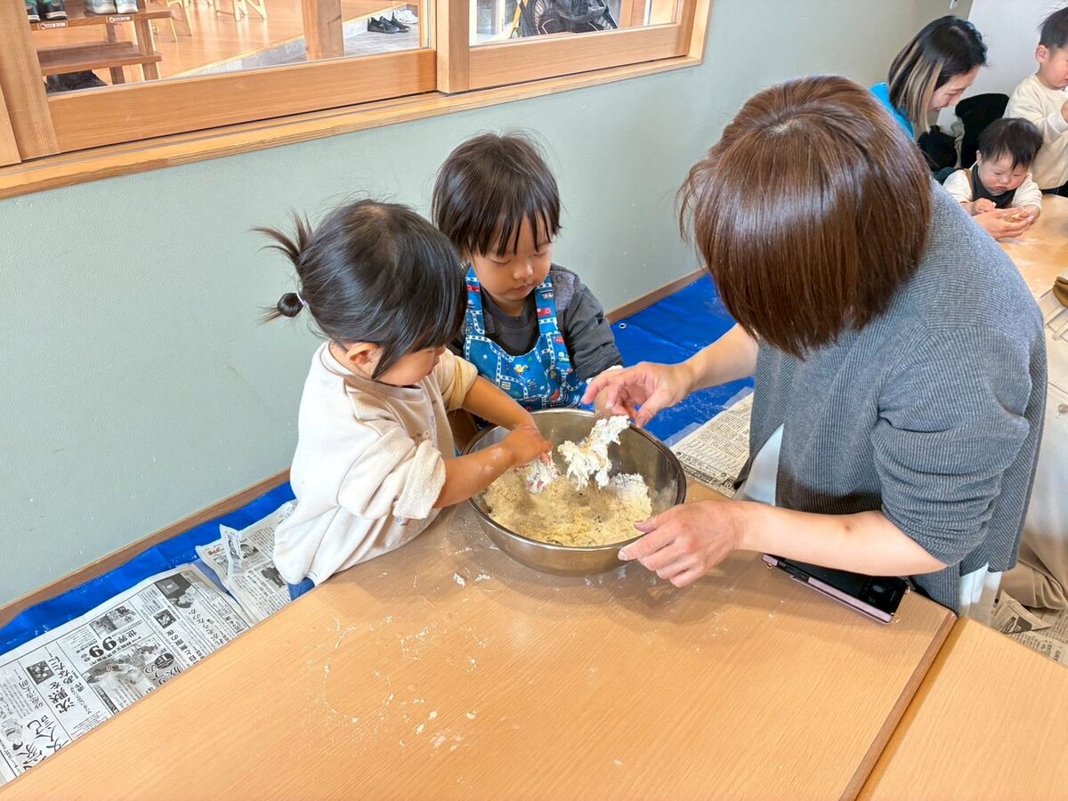 強力粉と薄力粉の触り心地の違いや、2つを混ぜて塩水を入れて捏ねたりと指先を使ってチャレンジ‼️手にたくさん粉がつくけどへっちゃらでこねこねするお友だち、ベタベタするのがちょっと苦手なお友だち、いろいろな感情を見せてくれるお友達。でも、それでいいんです😊それがいいんです!