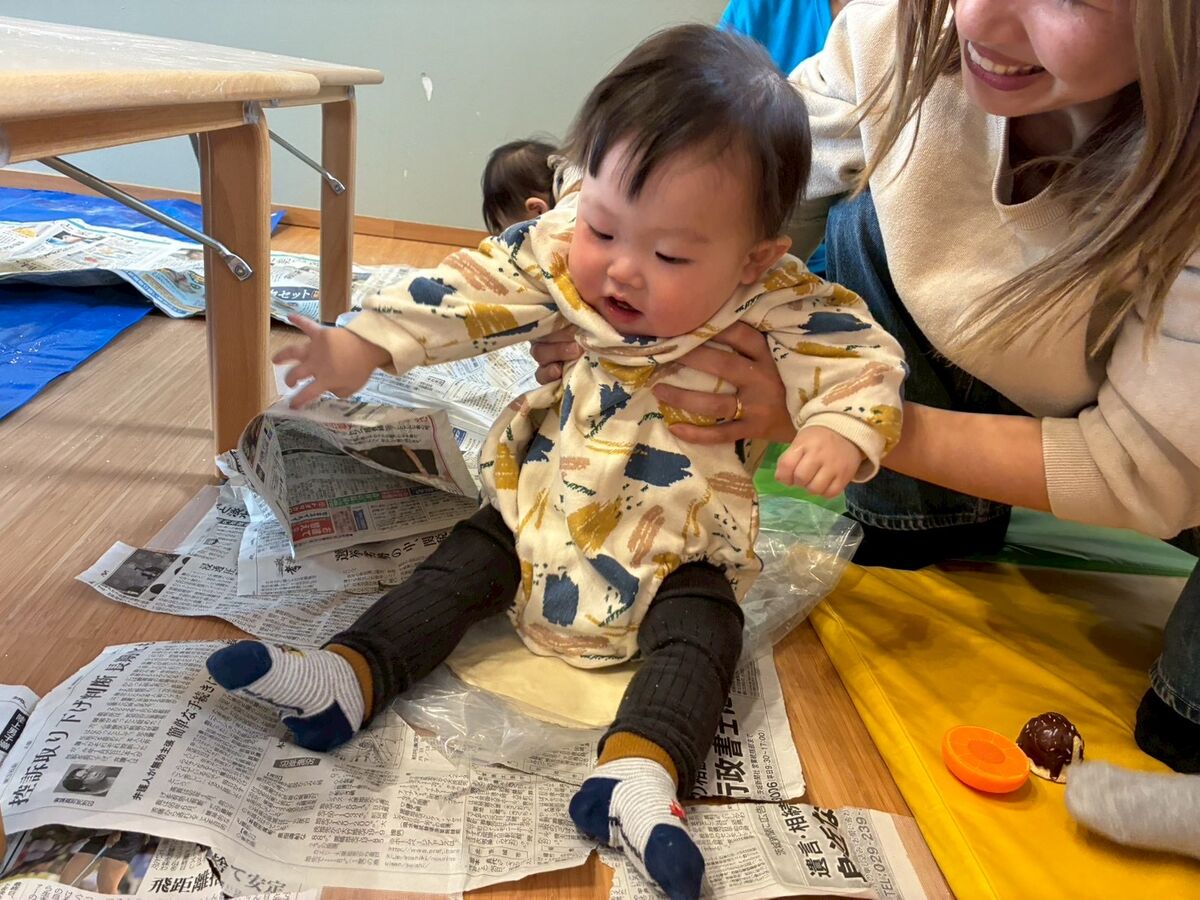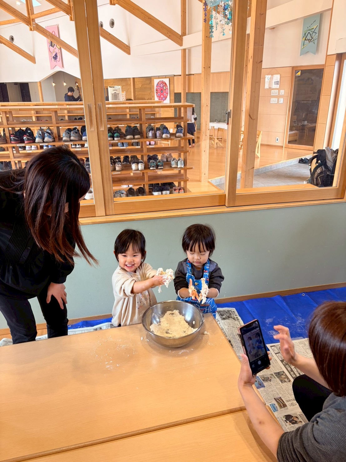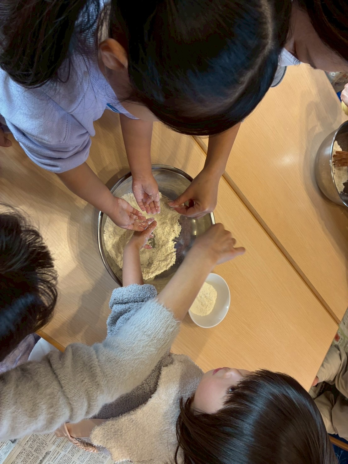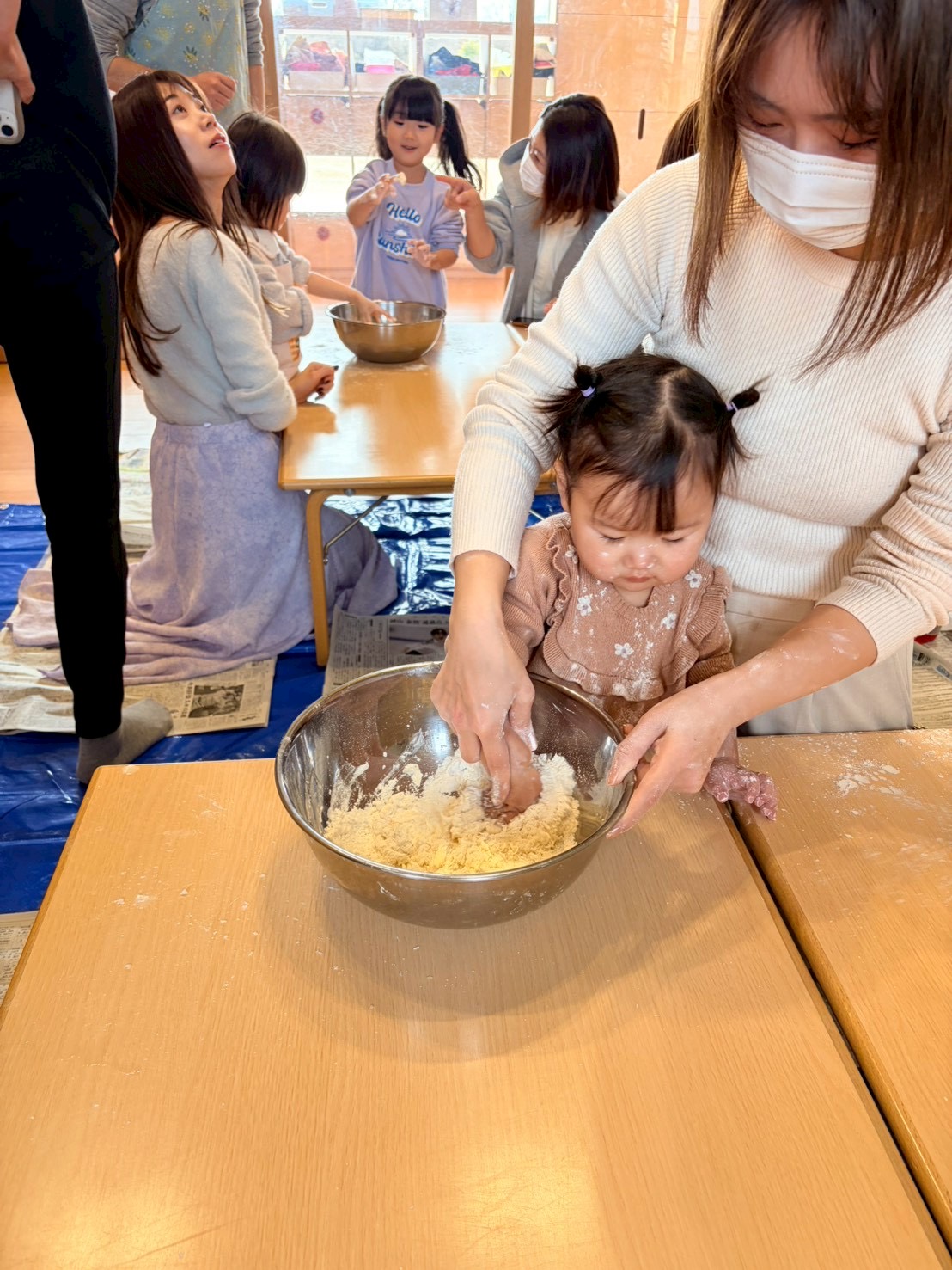強力粉と薄力粉の触り心地の違いや、2つを混ぜて塩水を入れて捏ねたりと指先を使ってチャレンジ‼️手にたくさん粉がつくけどへっちゃらでこねこねするお友だち、ベタベタするのがちょっと苦手なお友だち、いろいろな感情を見せてくれるお友達。でも、それでいいんです😊それがいいんです!