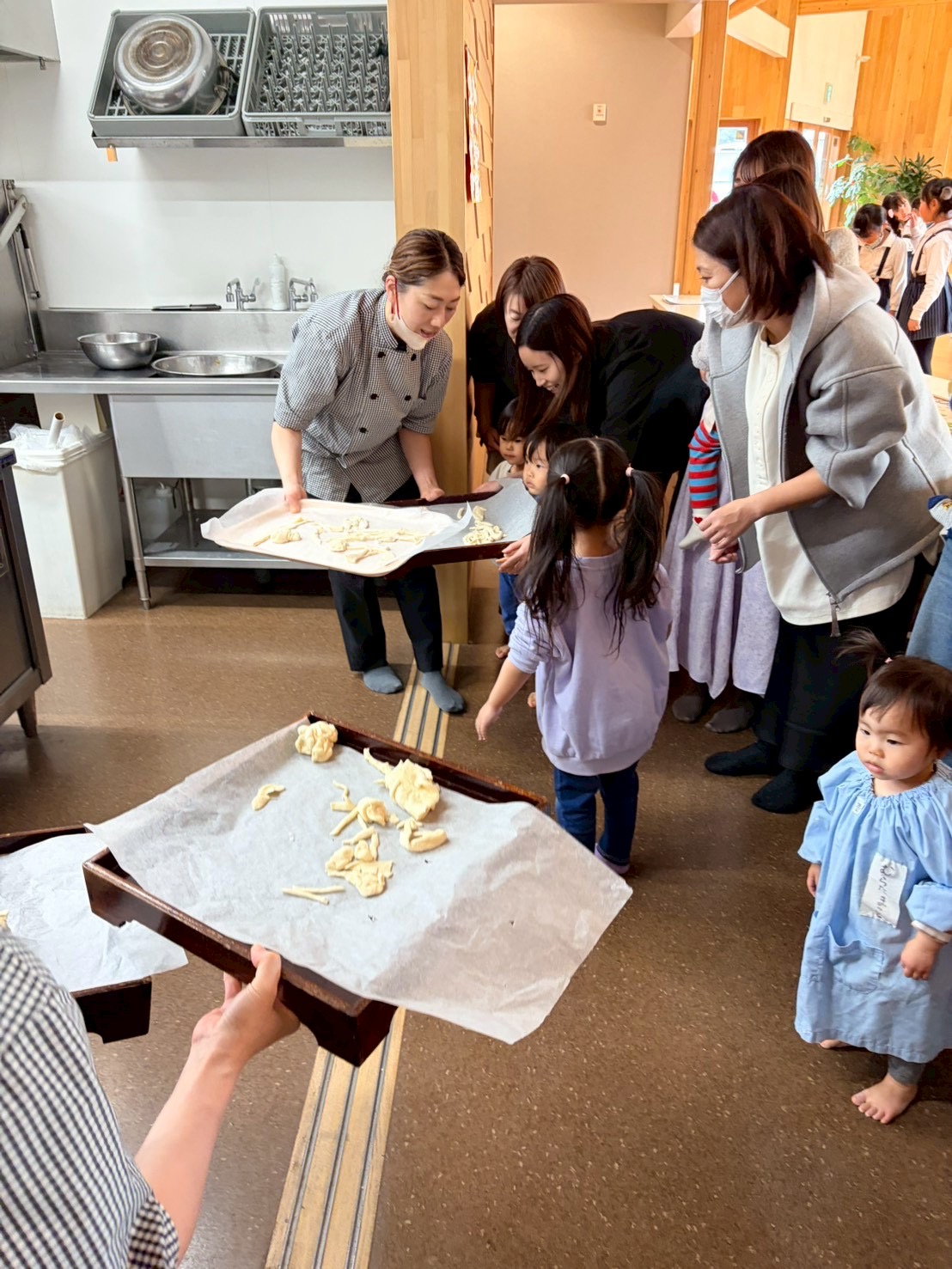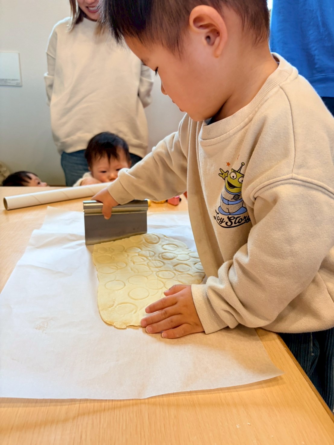 それから生地を伸ばして、スケッパーで切る体験も!!カット出来たら、みんなで給食室に持って行き、『お願いしまーす!!』とご挨拶しました🥰