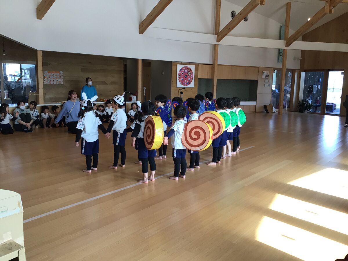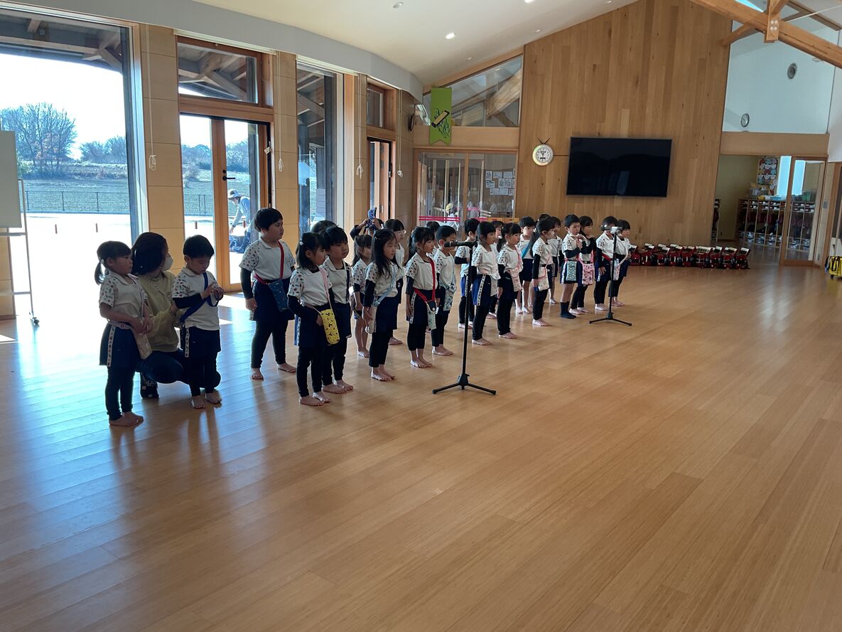 発表会が終わると、例年、寒さが和らいできて、園庭の芝生もほんの少しずつ緑に戻ってきます。春の訪れを感じながら…子どもたちは劇の歌を時々口ずさんだりしながら…楽しく遊んでいます。