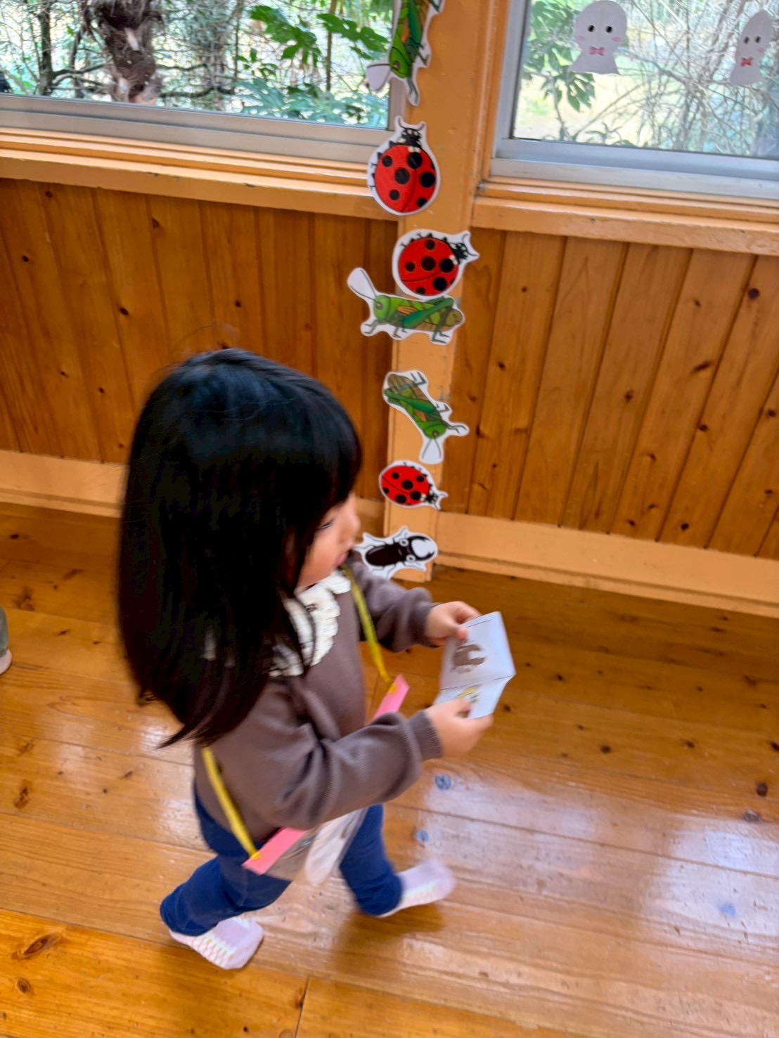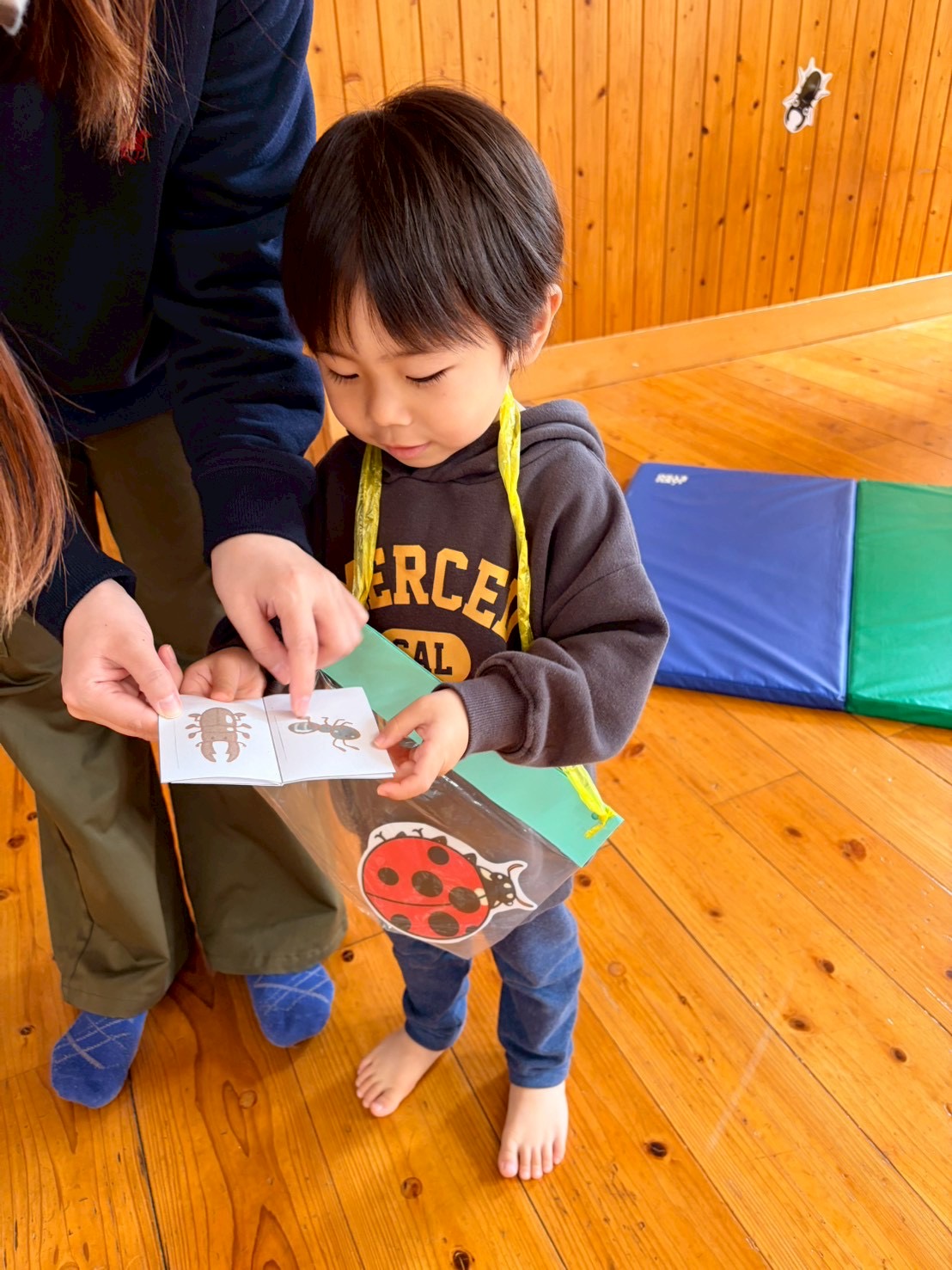 それから、お友だちは虫とり探検隊になって、バッグと探して欲しい虫の描かれた“ずかん”を手に持ち、虫とりスタートです🏁💨