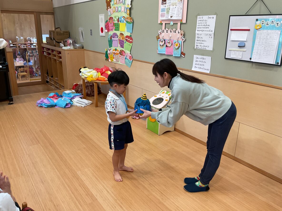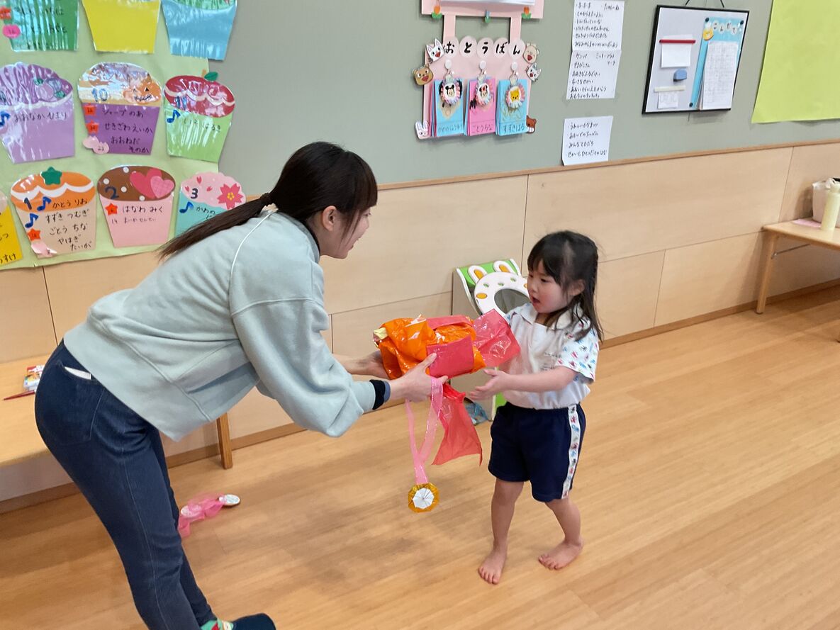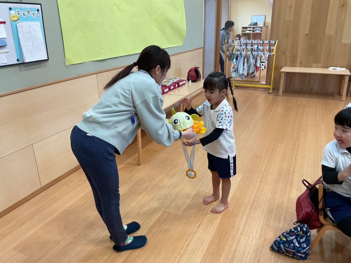 持ち前の明るさで、発表会を元気いっぱいにやりきった年中さん。まいか先生から、発表会の衣装を、メダルを添えて返してもらっていました!それはさながら表彰式のような…☆本当によく頑張ったね!来年の発表会の“大トリ”を楽しみにしてるよ!