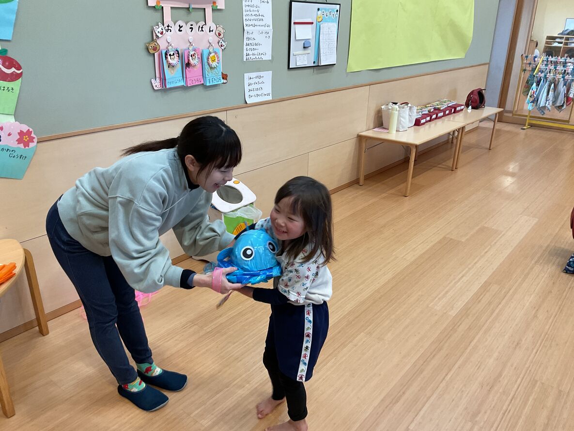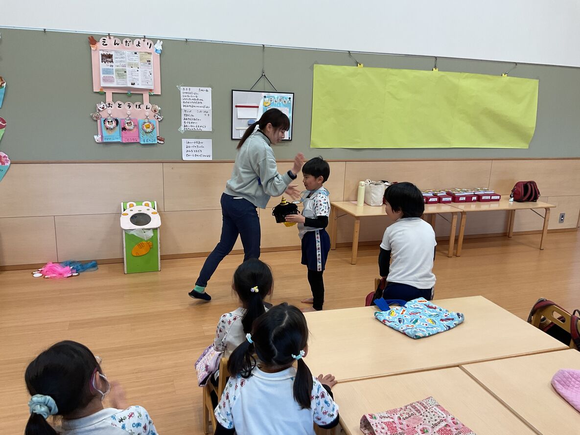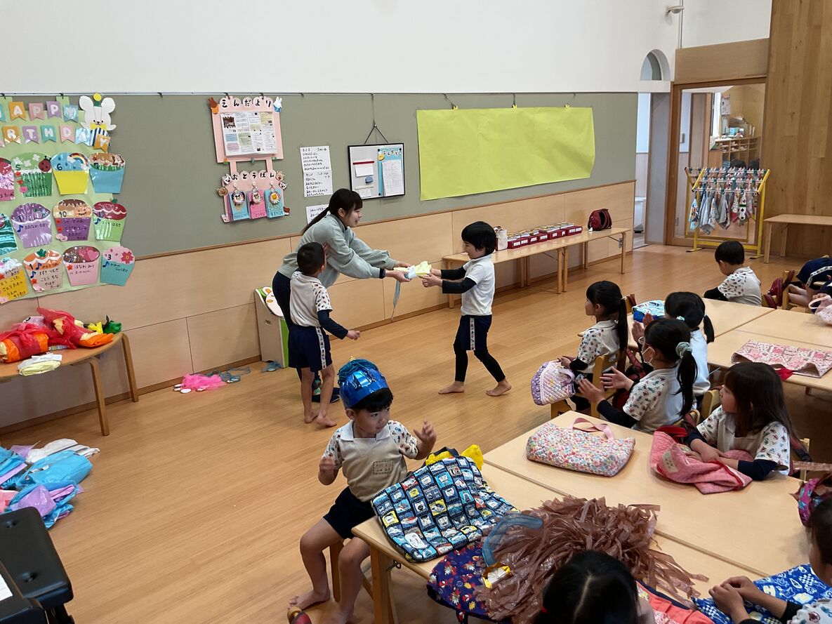 持ち前の明るさで、発表会を元気いっぱいにやりきった年中さん。まいか先生から、発表会の衣装を、メダルを添えて返してもらっていました!それはさながら表彰式のような…☆本当によく頑張ったね!来年の発表会の“大トリ”を楽しみにしてるよ!