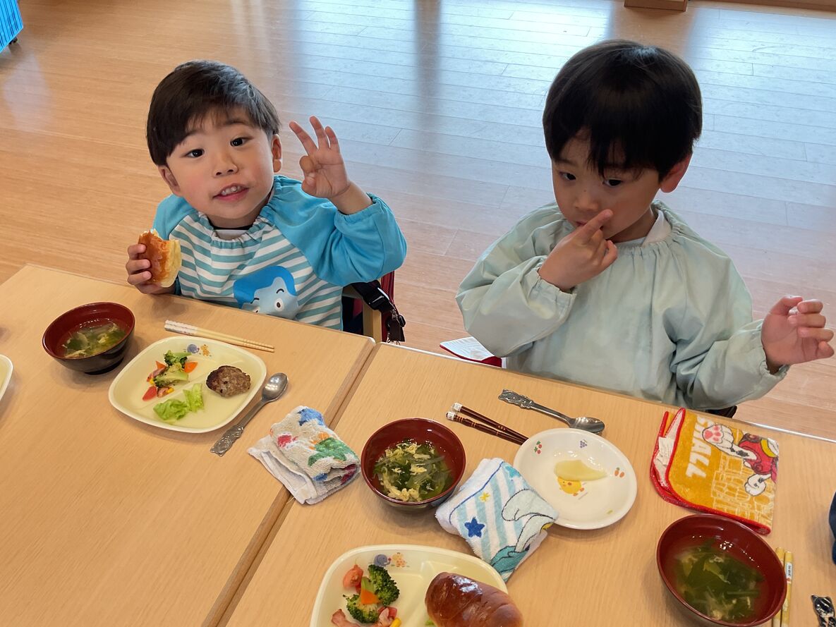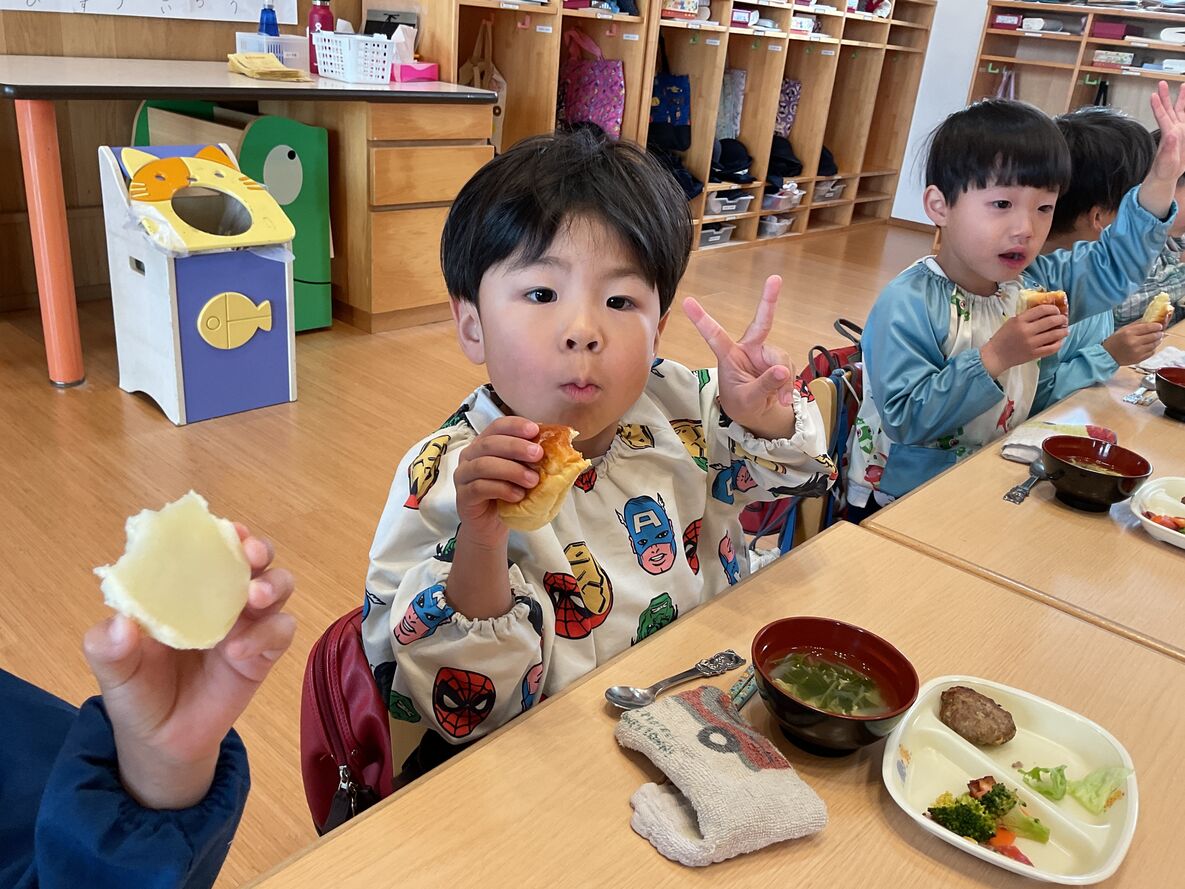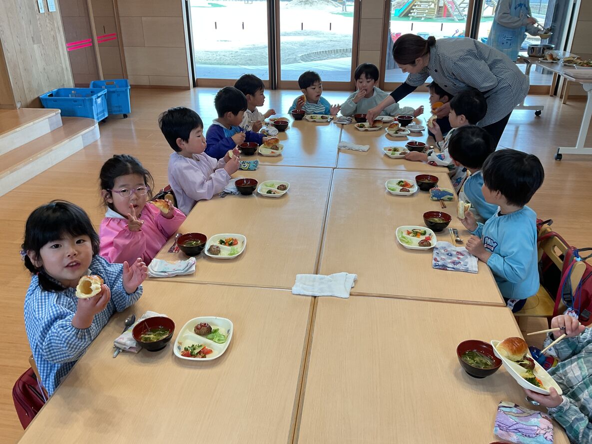 発表会後は、給食を縦割りクラスで食べる日が多くなりました。年長さんのお兄さん・お姉さんと一緒に食べられるのも…残りわずか。みんなでいろいろな意味で味わい深く過ごしたいですね!