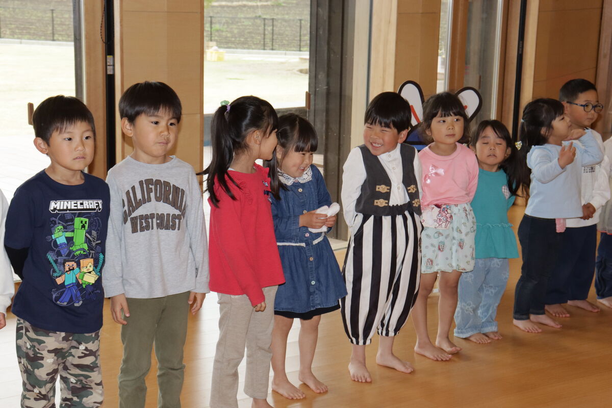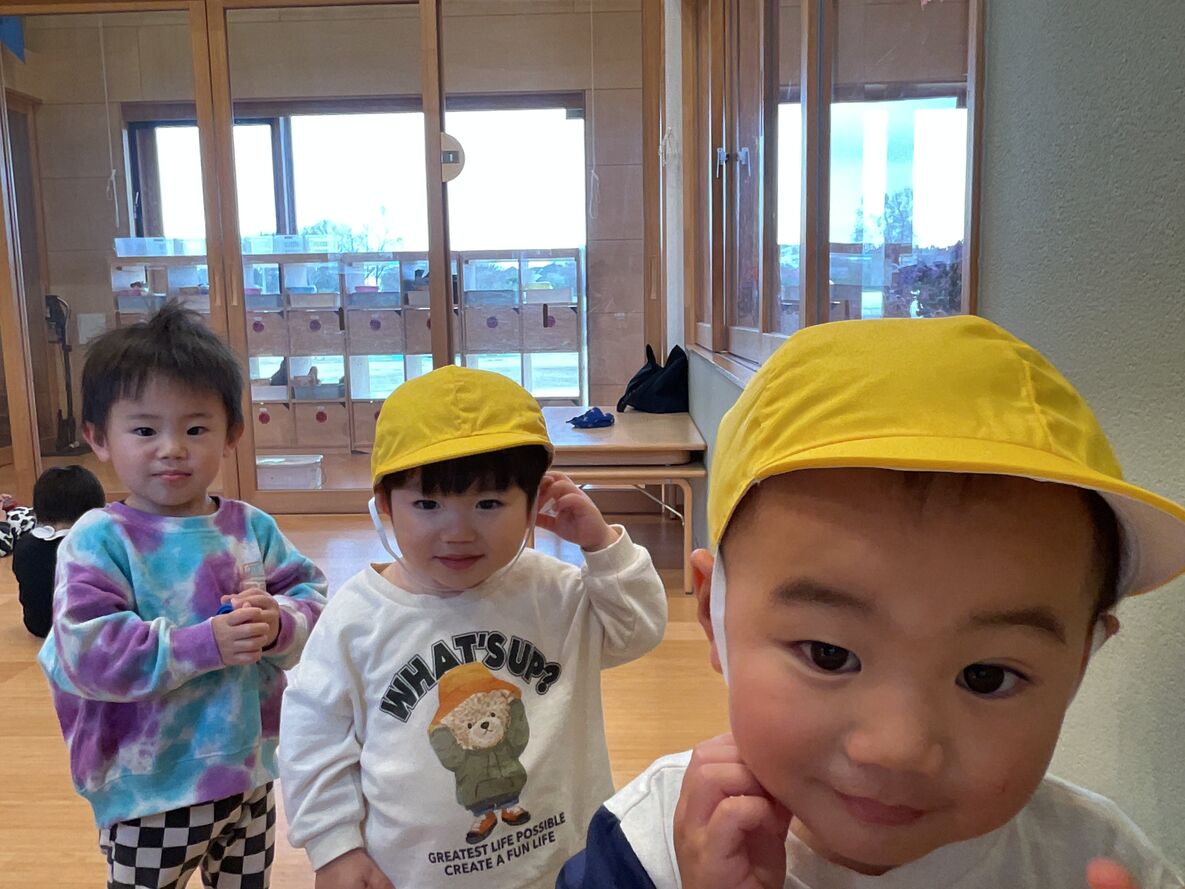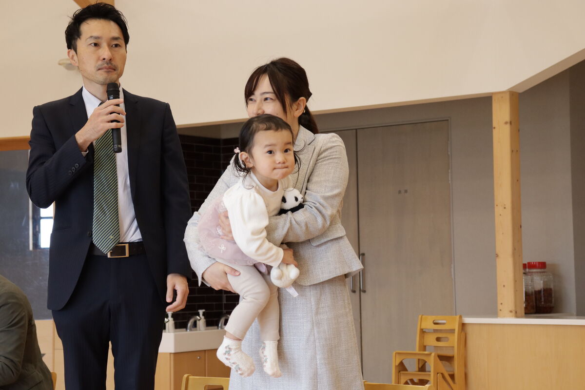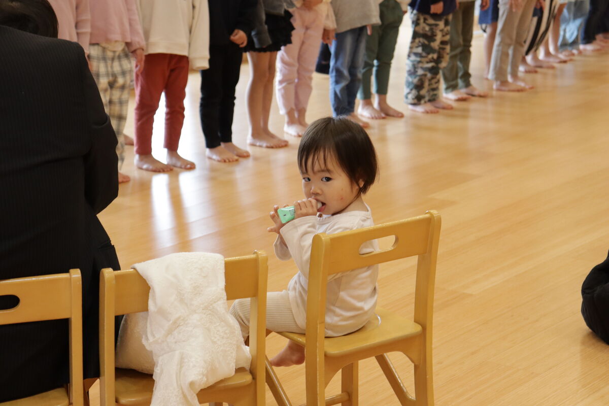 会の途中で…まさかのタイミングで、地震が!急遽、登園していたお友達と一緒に、テラスへ一時避難していただきました。鉄平先生もお話してくれましたが、新園舎は震度7でも耐えられる園舎ですので、ご安心ください!!